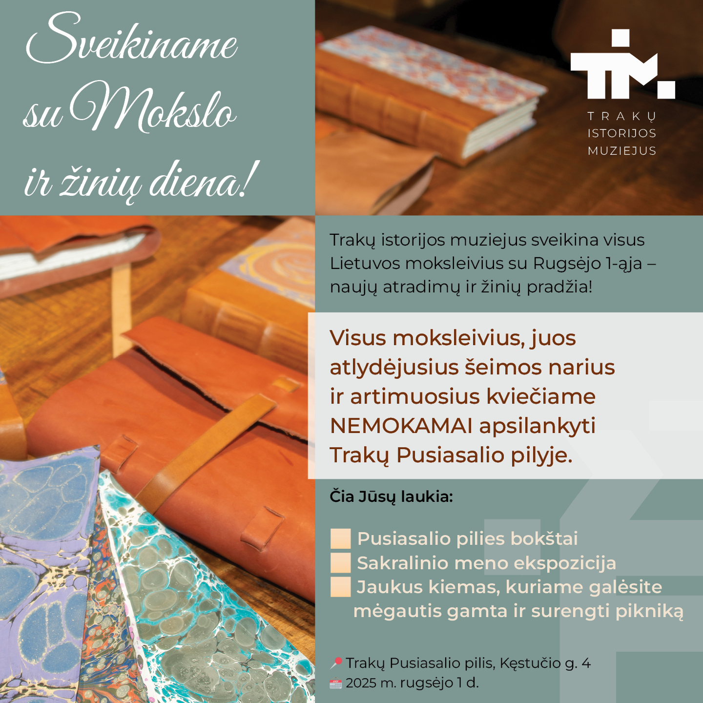 Rugsėjo 1-oji – tai ne tik naujų mokslo metų pradžia, bet ir graži šventė, primenanti apie pažinimo, atradimų bei kūrybos džiaugsmą. Trakų istorijos muziejus sveikina visus Lietuvos moksleivius su šia ypatinga diena ir kviečia kartu ją paminėti.
