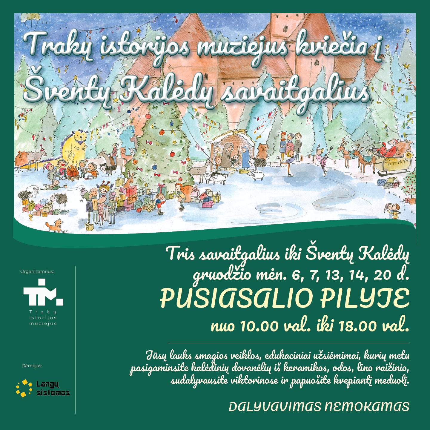 Šį gruodį Kalėdų dvasia ypač gyvai alsuos Trakuose. Advento savaitgaliais – gruodžio 6–7, 13–14 ir 20 dienomis – Trakų Pusiasalio pilies bokštai atgis veiklomis ir kūrybinėmis dirbtuvėmis. Senos akmeninės sienos priglaus juoką, muziką, vaikų balsus. Čia žmonės bursis draugėn kurti, lino raižinių Kalėdinius atvirukus, lipdys keramikinius Kalėdinius varpelius, kalėdinių knygučių įrišimas ir dekoravimas, lauks Šalčio pasaka – kepuryčių dirbtuvės ir daug kitų įvairių veiklų kurios padės puošti jūsų širdeles Kalėdine šviesa.